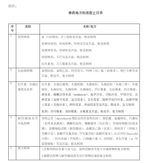 二、本公告发布之日,凡含有《废止目录》序号1~4药物成分的所有兽用原料药及其制剂地方质量标准,属于《废止目录》序号5的复方制剂地方质量标准均予同时废止。