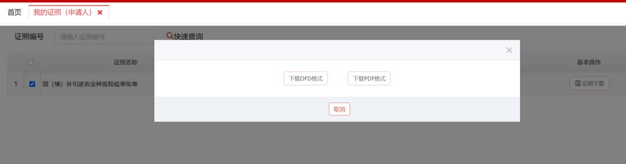 用户登录农业农村部政务服务平台,通过菜单“我的电子证照”进入“我的证照(申请人)”列表,如下图: