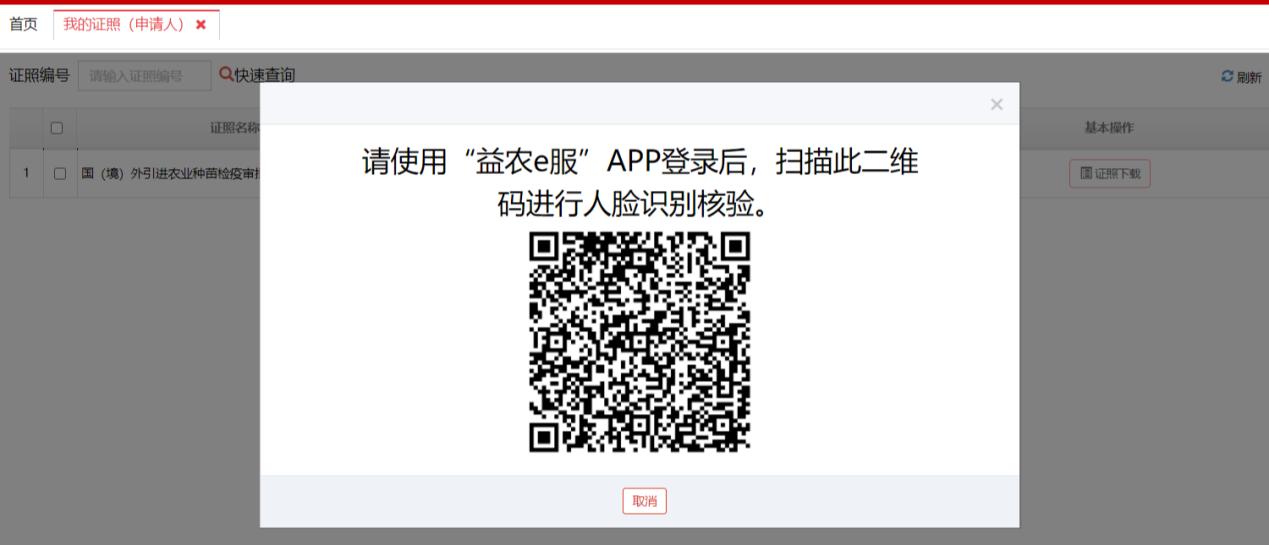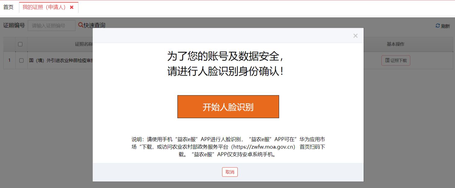点击【证照下载】按钮,系统提示:“为了您的账号及数据安全,请进行人脸识别身份确认!”。