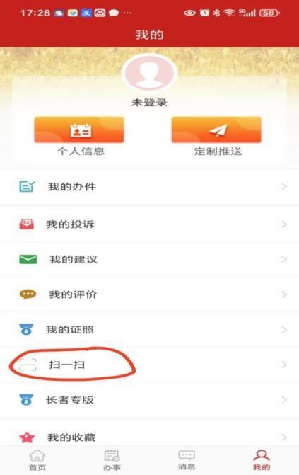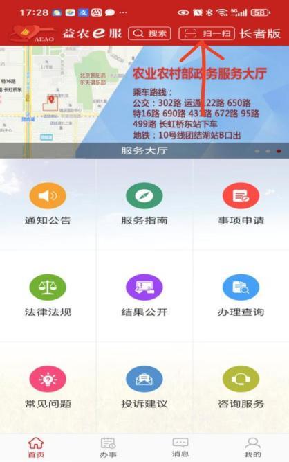 此时,打开已下载的“益农e 服”APP 并登录,用“扫一扫”功能扫描上图中的二维码。如下图所示: