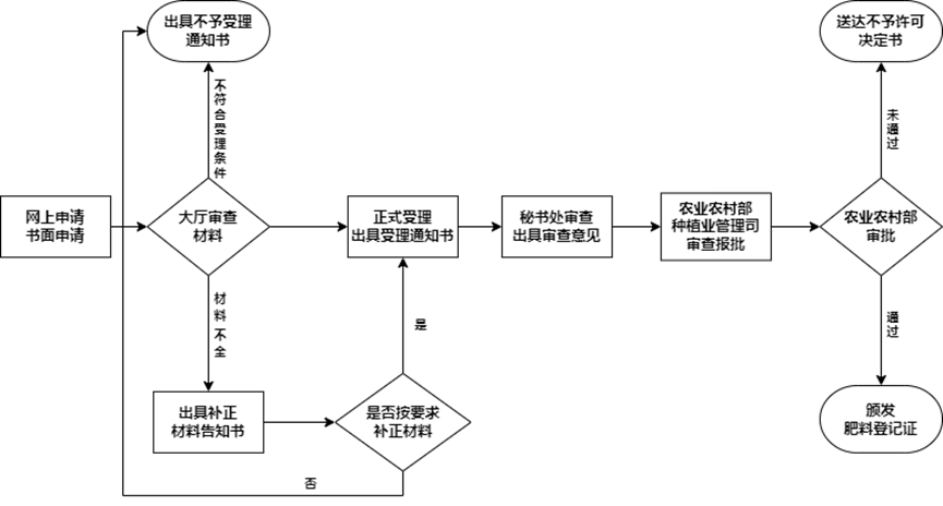 ㅤㅤ1)农业农村部政务服务大厅肥料窗口审查申请人递交的申请材料, 材料齐全符合法定形式的予以受理。